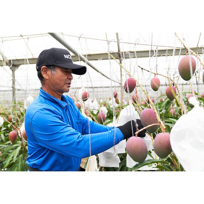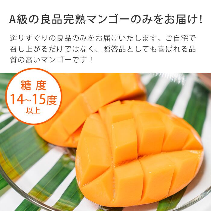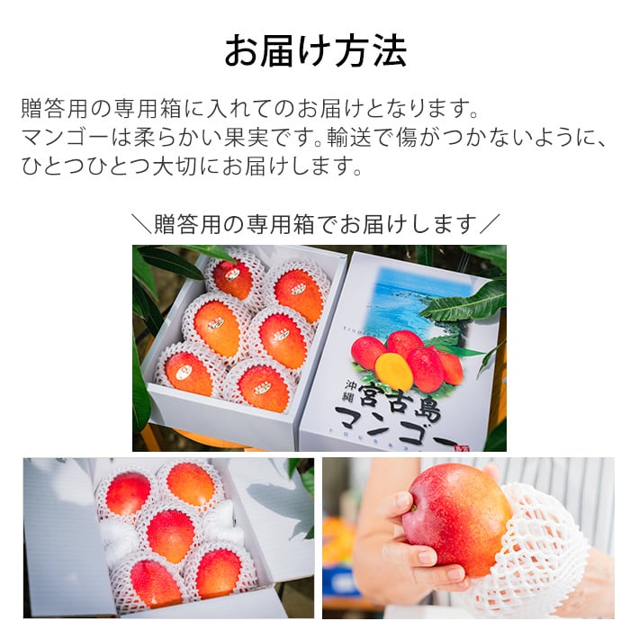 豊かな香りと濃厚で上品な甘さが特徴のアップルマンゴー。ご家族でお召し上がりになっても、大切な方への贈り物でも満足いただけること間違いなしの一品です。栽培からお届けまで安心してできる、新鮮な沖縄県宮古島産の完熟アップルマンゴーをお届けします。糖度14~15度以上、贈答用の専用箱入りです。