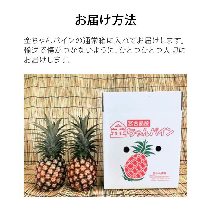 金ちゃんパインの通常箱に入れてお届けします。輸送で傷がつかないように、ひとつひとつ大切にお届けします。