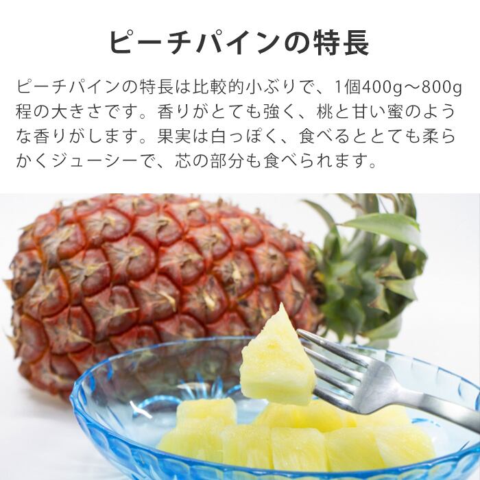 ピーチパインの特長は比較的小ぶりで、1個400g~800g程の大きさです。香りがとても強く、桃と甘い蜜のような香りがします。果実は白っぽく、食べるととても柔らかくジューシーで、芯の部分も食べられます。