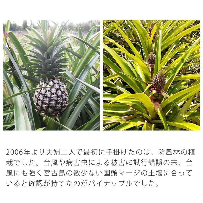 2006年より夫婦二人で最初に手掛けたのは、防風林の植栽でした。台風や病害虫による被害に試行錯誤の末、台風にも強く宮古島の数少ない国頭マージの土壌に合っていると確認が持てたのがパイナップルでした。